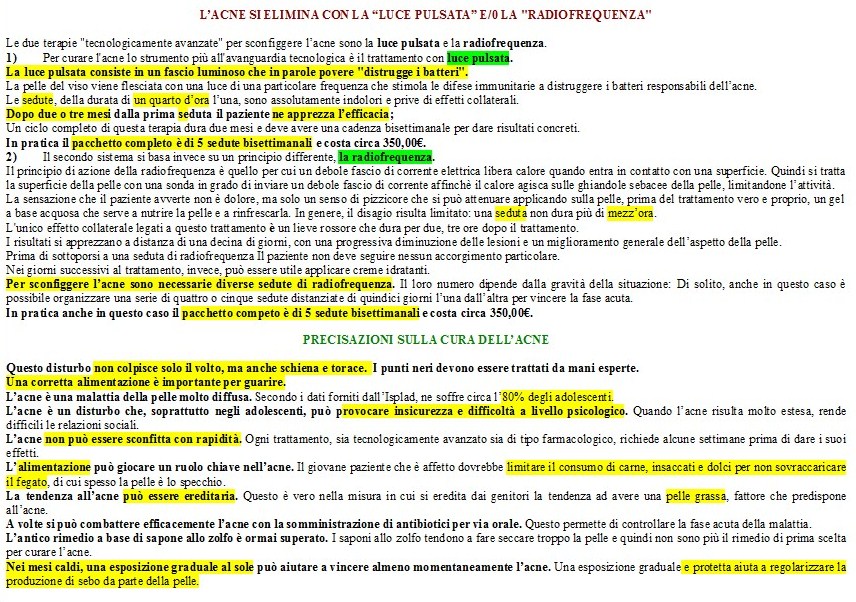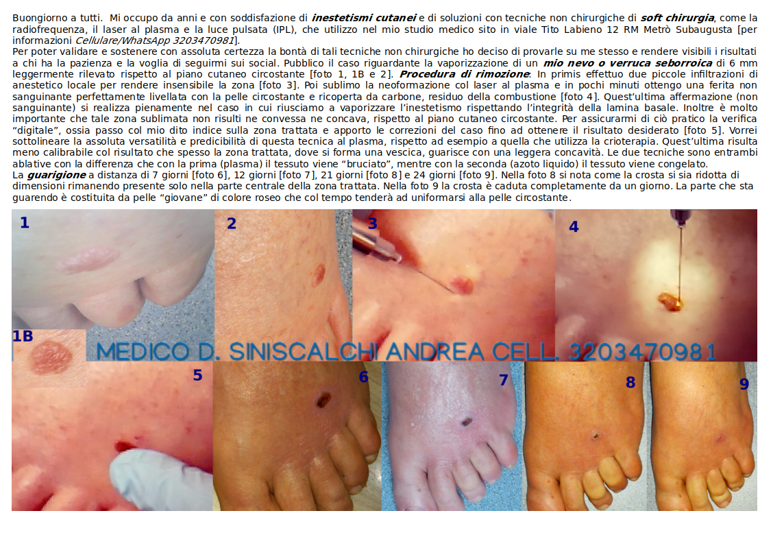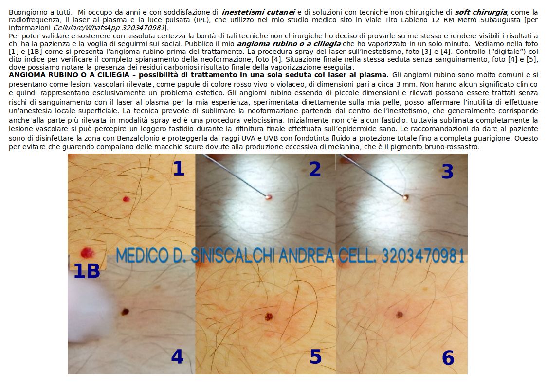 Effettuo interventi di "chirurgia soft" con laser al plasma sul viso. Rimuovo per sublimazione (vaporizzazione) nevi, neoplasie cutanee benigne (angiomi e fibromi penduli papilloma squamoso, condilomi, fibromi penduli, grani di miglio), dermatocalasi, cisti sebacee,macchie senili (asportazione oltre lo strato corneo). Effettuo trattamenti sulle rughe del viso e periorali, acne attiva e cicatrici post-acne, cheloidi , verruche, etc.