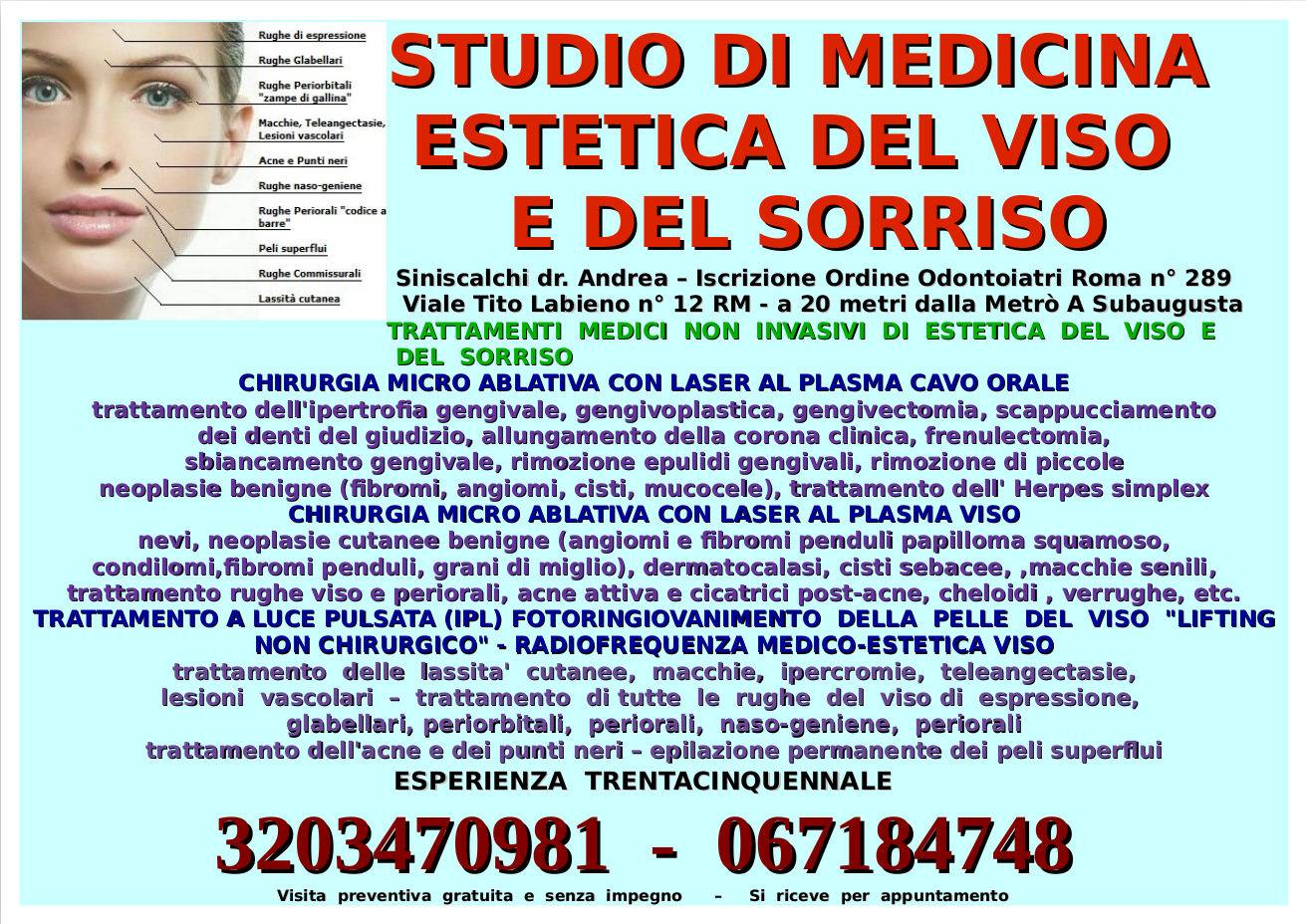 Sono titolare dal 1897 di STUDIO ODONTOIATRICO CON ANNESSO LABORATORIO ODONTOTECNICO e di STUDIO DI MEDICINA ESTETICA DEL VISO E DEL SORRISO sito in viale Tito Labieno 12 metrò A Subaugusta.