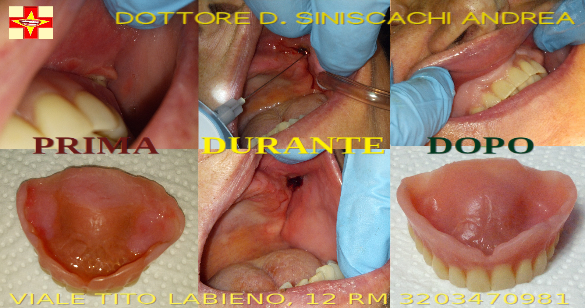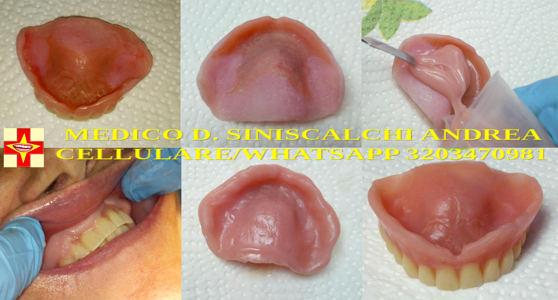 La ribasatura immediata della dentiera serve per ripristinare forma e stabilità primaria. Si effettuata con impronta diretta riempiendo con resina specifica la protesi internamente irruvidita e cosparsa di adesivo. Segue rifinitura e lucidatura con dischi feltro e pietra pomice.